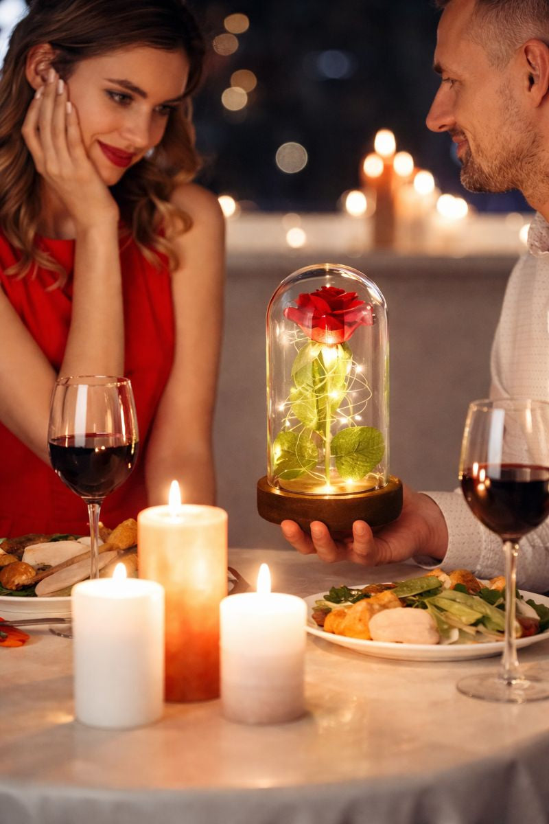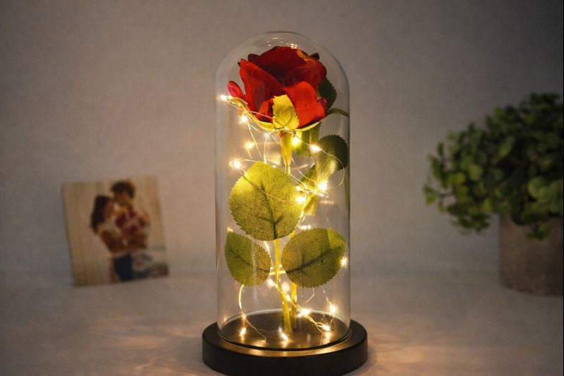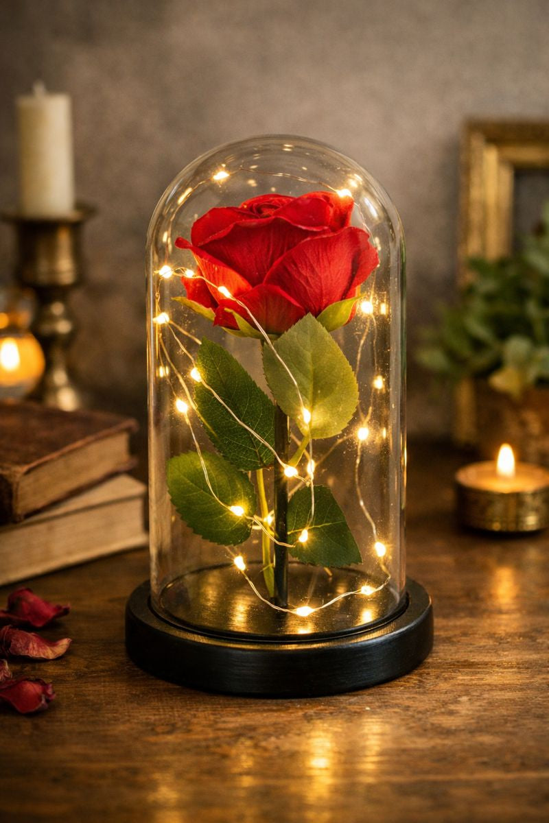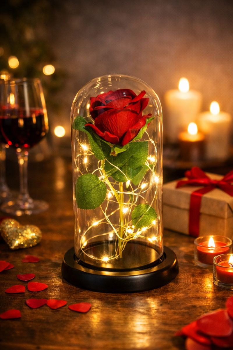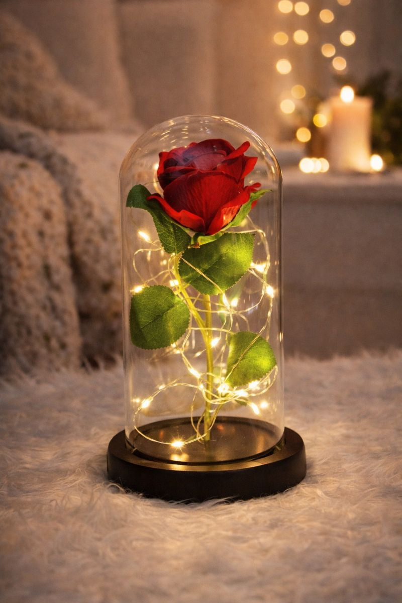 🌹 Wieczna Róża w Szklanej Kopule z Podświetleniem – magia zamknięta w detalu